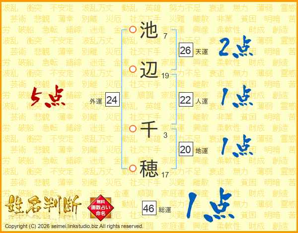 生活面を象徴する運勢です。外部から受ける影響力を表し、結婚運、家庭運や職場、環境への順応性を表します。総運から人運を引いた画数。姓や名が1文字の場合を除く。