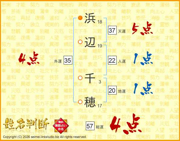 浜(18画)辺(19画) 千(3画)穂(17画)