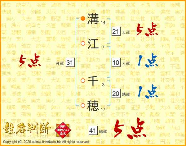 生活面を象徴する運勢です。外部から受ける影響力を表し、結婚運、家庭運や職場、環境への順応性を表します。総運から人運を引いた画数。姓や名が1文字の場合を除く。