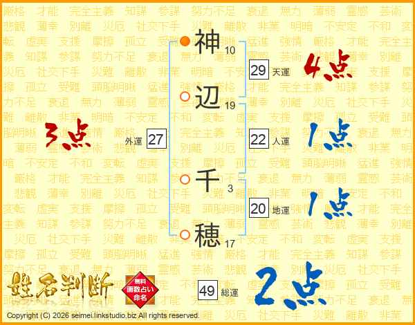 神(10画)辺(19画) 千(3画)穂(17画)