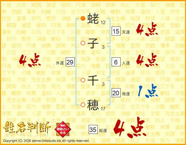 蛯(12画)子(3画) 千(3画)穂(17画)