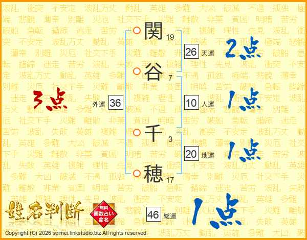 関(19画)谷(7画) 千(3画)穂(17画)