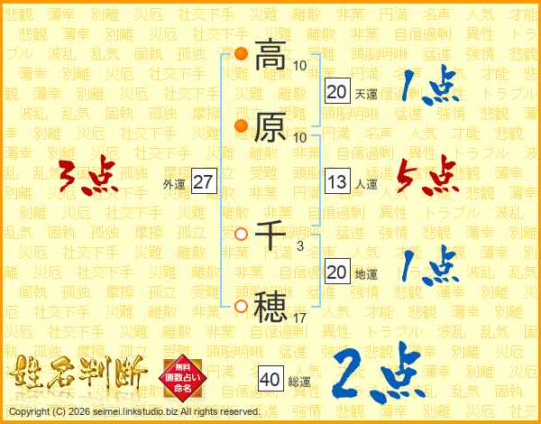 生活面を象徴する運勢です。外部から受ける影響力を表し、結婚運、家庭運や職場、環境への順応性を表します。総運から人運を引いた画数。姓や名が1文字の場合を除く。