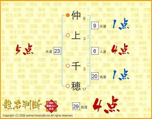仲(6画)上(3画) 千(3画)穂(17画)