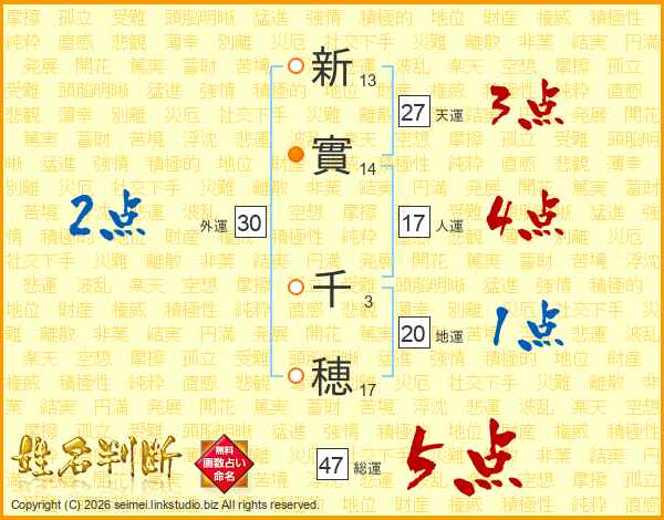 生活面を象徴する運勢です。外部から受ける影響力を表し、結婚運、家庭運や職場、環境への順応性を表します。総運から人運を引いた画数。姓や名が1文字の場合を除く。