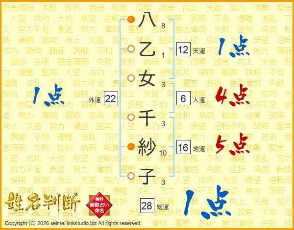 八(8画)乙(1画)女(3画) 千(3画)紗(10画)子(3画)