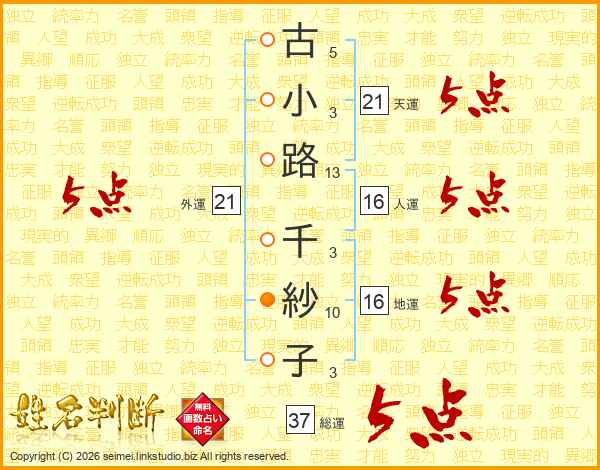古(5画)小(3画)路(13画) 千(3画)紗(10画)子(3画)