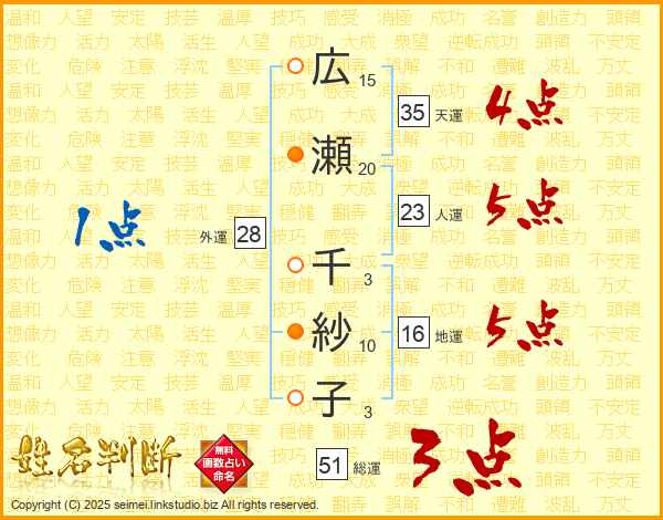 広(15画)瀬(20画) 千(3画)紗(10画)子(3画)