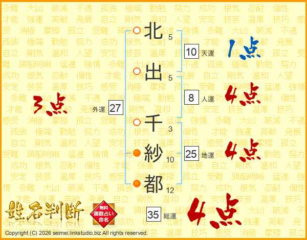 北(5画)出(5画) 千(3画)紗(10画)都(12画)