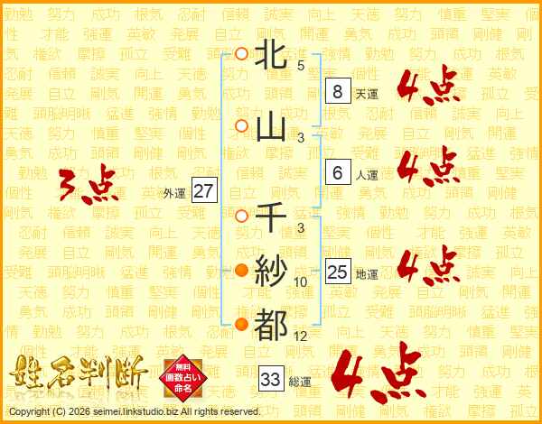 北(5画)山(3画) 千(3画)紗(10画)都(12画)