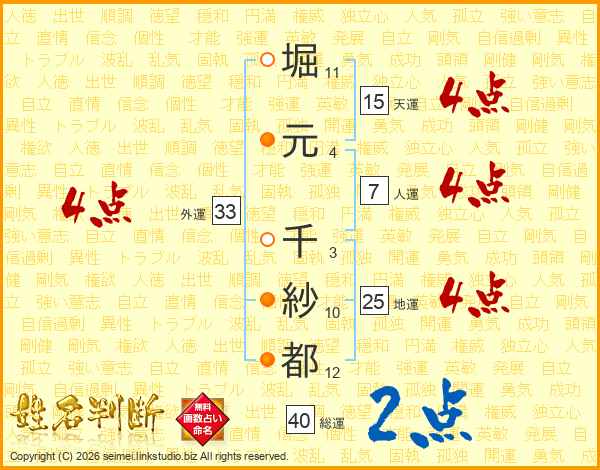 堀(11画)元(4画) 千(3画)紗(10画)都(12画)