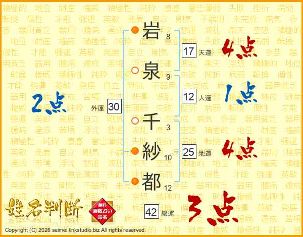 岩(8画)泉(9画) 千(3画)紗(10画)都(12画)