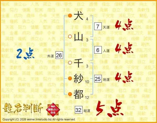 犬(4画)山(3画) 千(3画)紗(10画)都(12画)