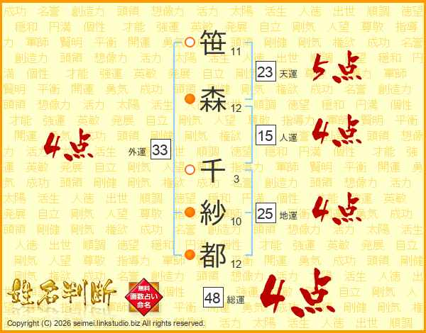 笹(11画)森(12画) 千(3画)紗(10画)都(12画)