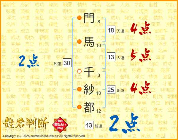 門(8画)馬(10画) 千(3画)紗(10画)都(12画)