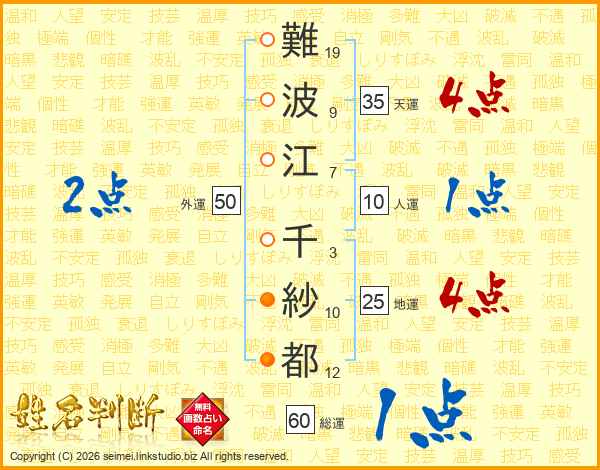 難(19画)波(9画)江(7画) 千(3画)紗(10画)都(12画)