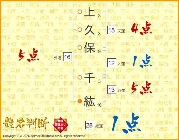 上(3画)久(3画)保(9画) 千(3画)紘(10画)