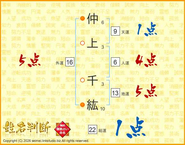 生活面を象徴する運勢です。外部から受ける影響力を表し、結婚運、家庭運や職場、環境への順応性を表します。総運から人運を引いた画数。姓や名が1文字の場合を除く。