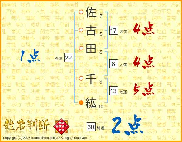 佐(7画)古(5画)田(5画) 千(3画)紘(10画)