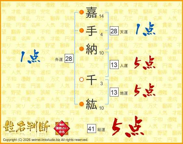 嘉(14画)手(4画)納(10画) 千(3画)紘(10画)