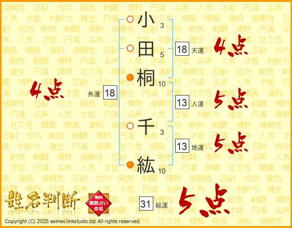 小(3画)田(5画)桐(10画) 千(3画)紘(10画)