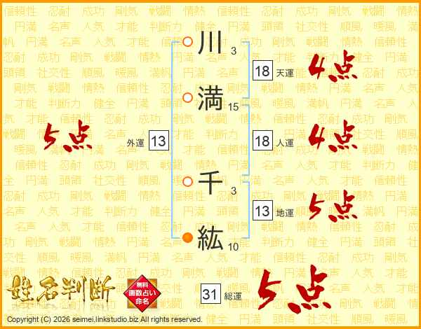 あなたの人生を表す1番重要な運勢です。生涯を通じて影響する総合運となり、主に50歳以降の晩年期に影響を及ぼします。苗字と名前の合計画数。