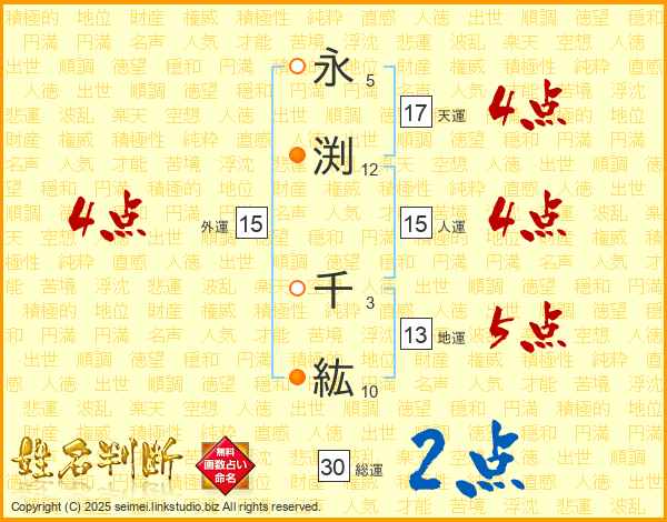 生活面を象徴する運勢です。外部から受ける影響力を表し、結婚運、家庭運や職場、環境への順応性を表します。総運から人運を引いた画数。姓や名が1文字の場合を除く。