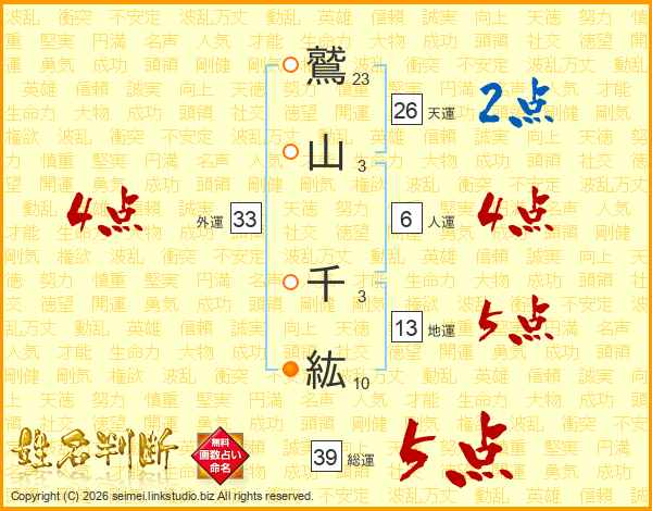 鷲(23画)山(3画) 千(3画)紘(10画)