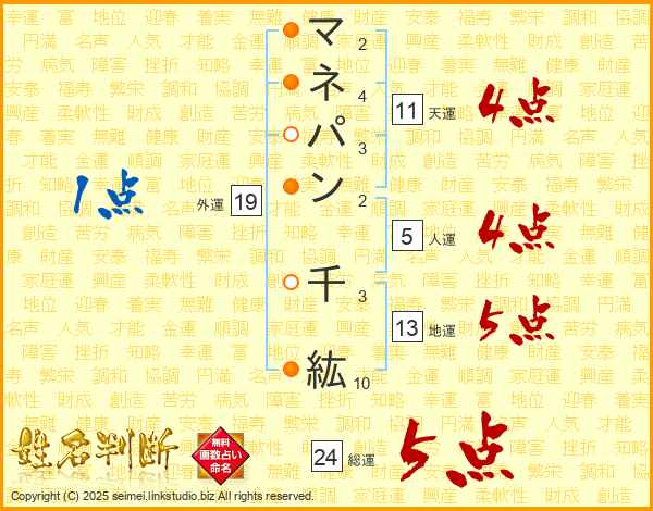 マ(2画)ネ(4画)パ(3画)ン(2画) 千(3画)紘(10画)