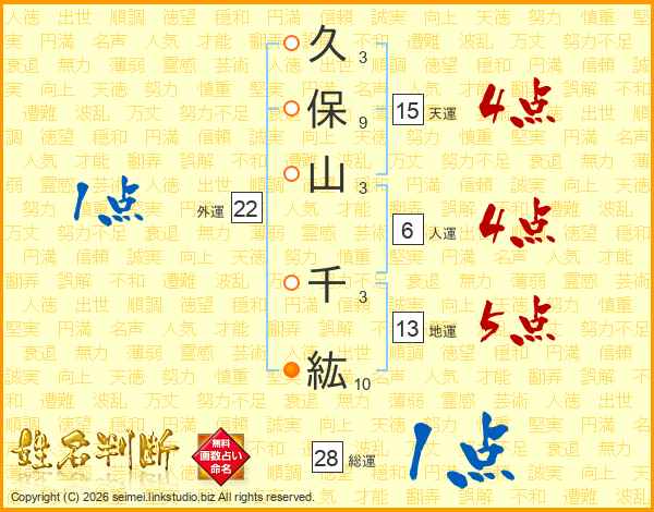 久(3画)保(9画)山(3画) 千(3画)紘(10画)