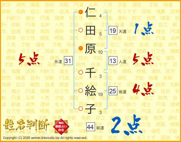 仁(4画)田(5画)原(10画) 千(3画)絵(19画)子(3画)