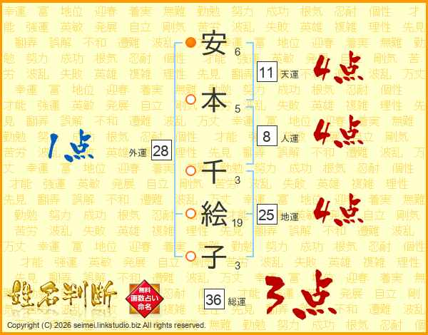 安(6画)本(5画) 千(3画)絵(19画)子(3画)