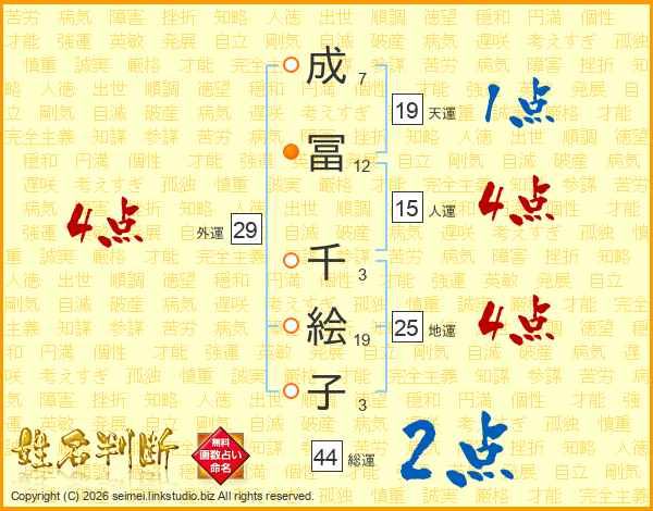 成冨千絵子さんの総運は44画の2点!