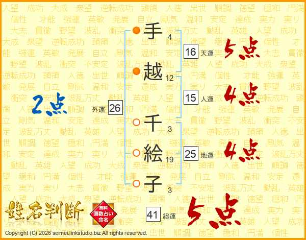 手越千絵子さんの総運は41画の5点!