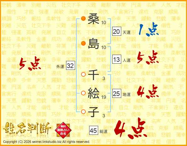 桑(10画)島(10画) 千(3画)絵(19画)子(3画)