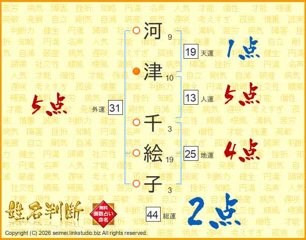 河(9画)津(10画) 千(3画)絵(19画)子(3画)