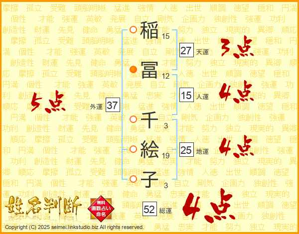 稲(15画)冨(12画) 千(3画)絵(19画)子(3画)