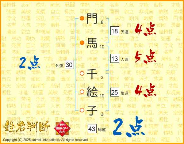 門(8画)馬(10画) 千(3画)絵(19画)子(3画)