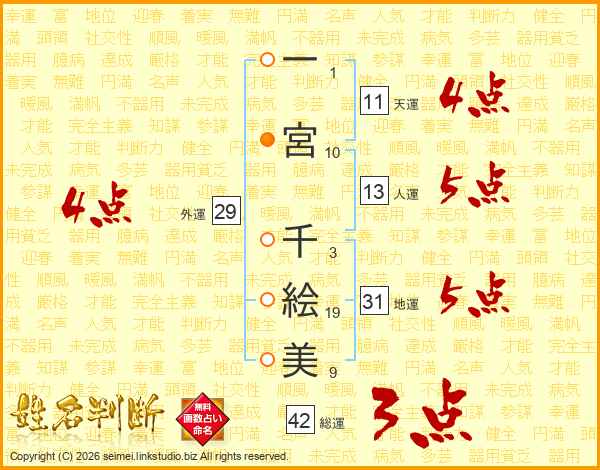 一(1画)宮(10画) 千(3画)絵(19画)美(9画)