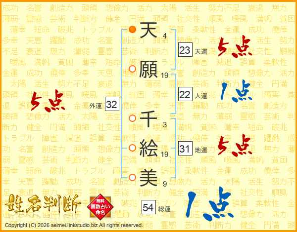 天(4画)願(19画) 千(3画)絵(19画)美(9画)