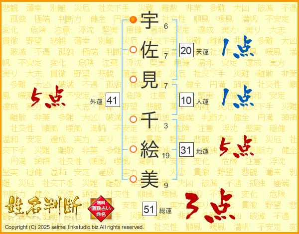 宇(6画)佐(7画)見(7画) 千(3画)絵(19画)美(9画)