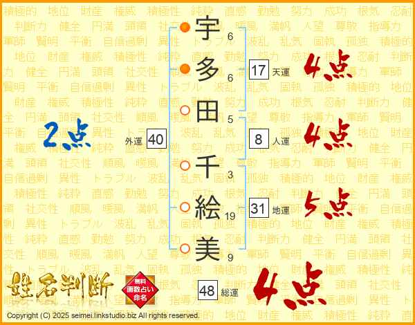 宇(6画)多(6画)田(5画) 千(3画)絵(19画)美(9画)