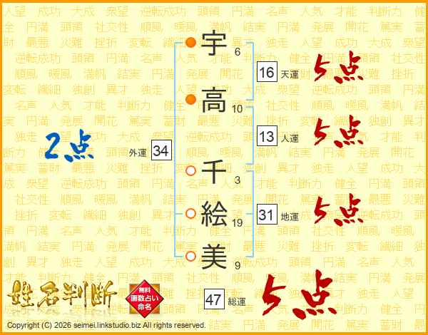 宇(6画)高(10画) 千(3画)絵(19画)美(9画)