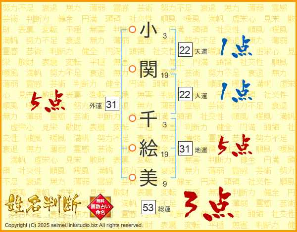 小(3画)関(19画) 千(3画)絵(19画)美(9画)
