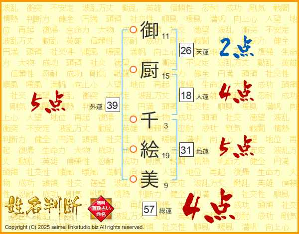 御(11画)厨(15画) 千(3画)絵(19画)美(9画)