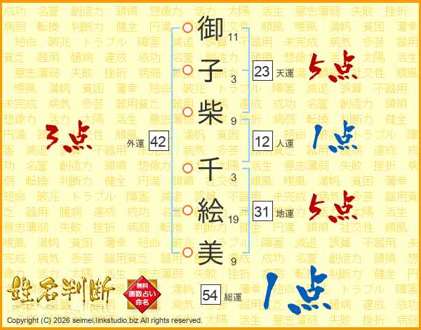 御(11画)子(3画)柴(9画) 千(3画)絵(19画)美(9画)