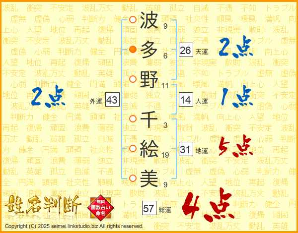 波(9画)多(6画)野(11画) 千(3画)絵(19画)美(9画)
