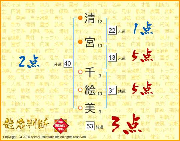 清(12画)宮(10画) 千(3画)絵(19画)美(9画)