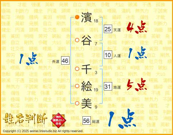濱(18画)谷(7画) 千(3画)絵(19画)美(9画)