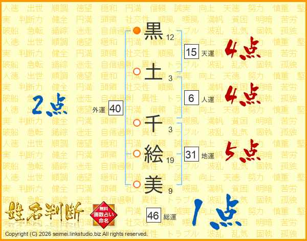 黒(12画)土(3画) 千(3画)絵(19画)美(9画)